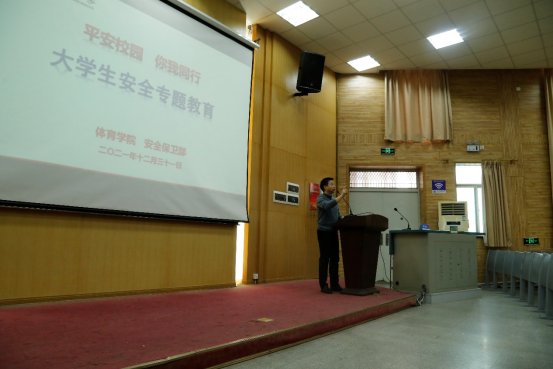 安全保卫部副部长彭冠军做“平安校园 你我同行——大学生安全专题教育”讲座。彭部长重点讲解了防火、防盗、防范电信网络诈骗、校园贷、交通安全等内容,指出同学们要对不明客服、二维码和链接等提高警惕,时刻注意安全和健康,及时下载全民反诈app。