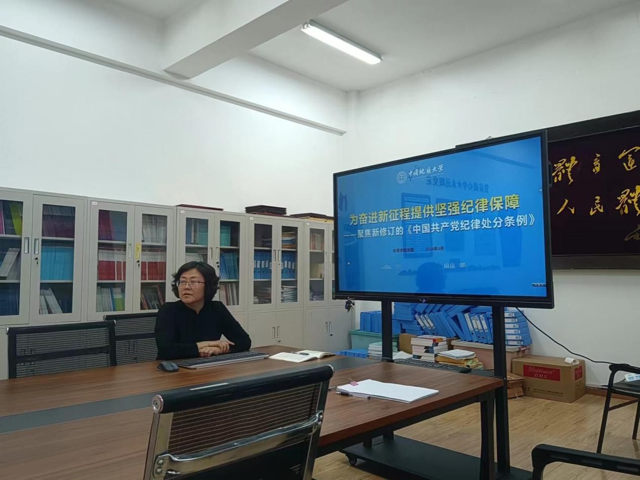 2024年4月25日下午司机社 党委在西区体育馆党员之家举行学院党委理论学习中心组专题学习。庞岚书记主讲题为“为奋进新征程提供坚强纪律保障——聚焦新修订的《中国共产党纪律处分条例》”的党课,学院党委委员、班子成员、分工会主席等参加了此次学习活动。