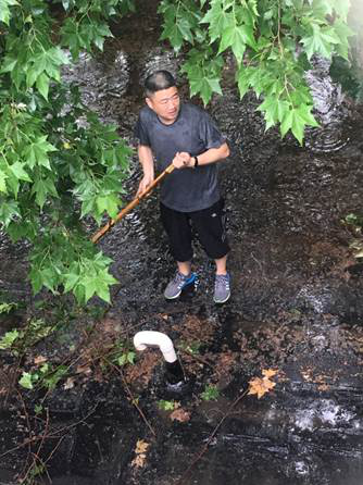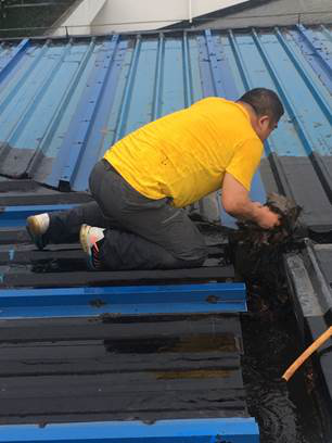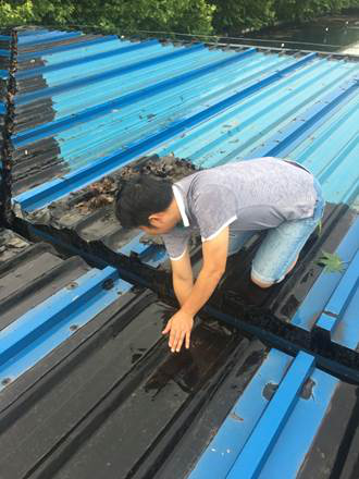 外面暴雨如注,馆内有如水帘洞。突击队借助梯子爬上攀岩馆屋顶,查明了漏水原因:由于长时间没有清理,树叶堵塞了下水口,致使屋顶排水沟积水无法下流而漏入馆内。几位同志冒着大雨小心翼翼地走在湿滑的、没有栏杆的铁皮屋顶上,寻找每一个下水口,然后趴着用手把树叶清理干净,积水很快排尽,攀岩馆漏水的问题解决了。