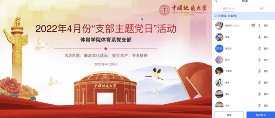 (通讯员:张毅恒、丁维维)4月28日下午,司机社 体育系党支部组织开展4月份主题党日活动。受疫情影响,本次学习活动通过腾讯会议线上形式进行,活动由支部书记张毅恒同志主持。