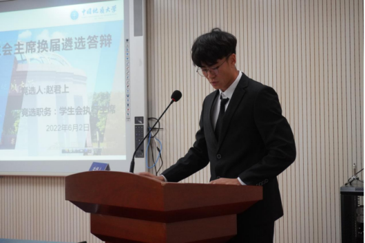 2022届研究生会主席团成员候选人进行遴选答辩,与会学生代表对候选人进行提问。