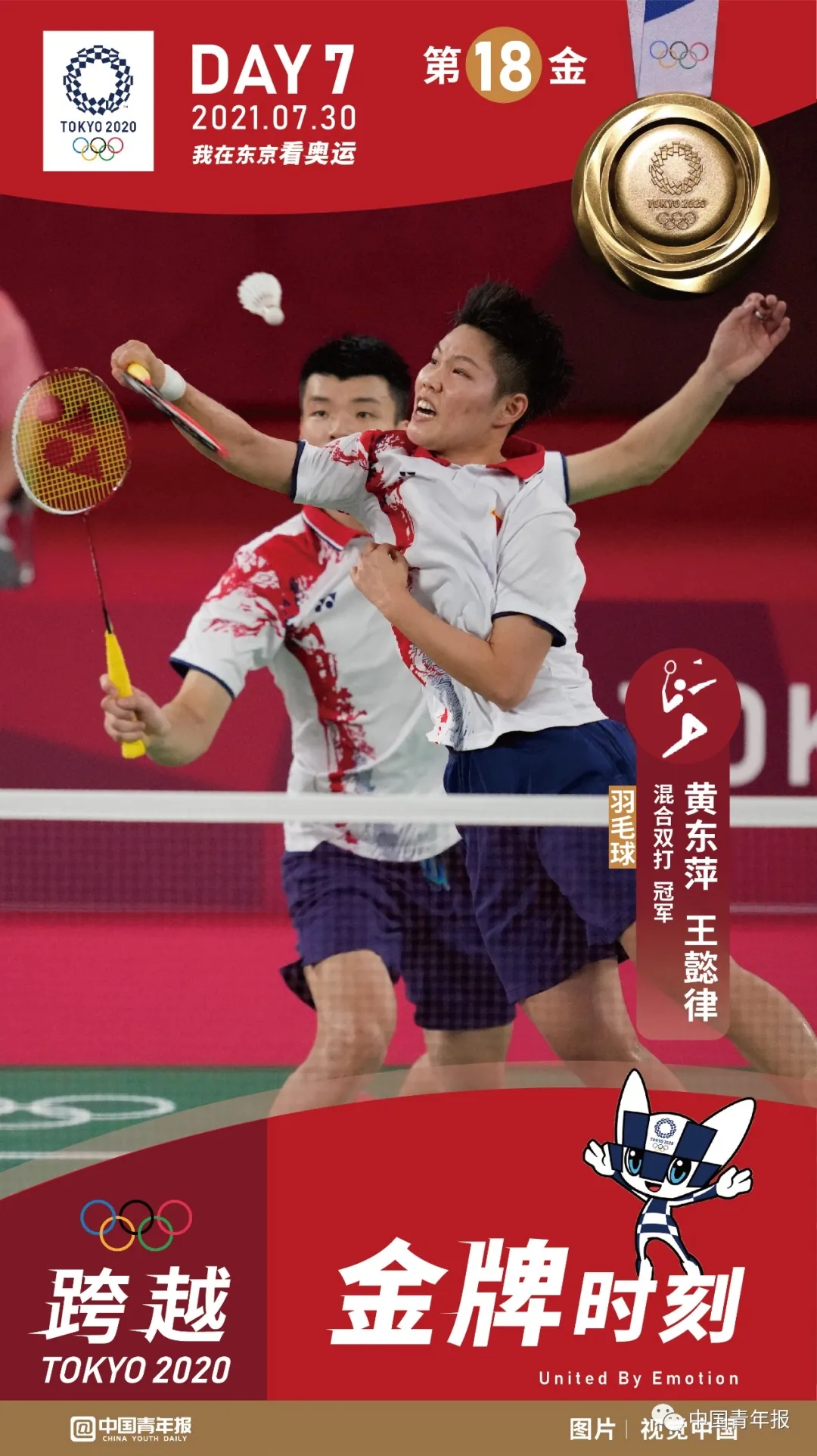 东京奥运会羽毛球混双决赛今天在两对中国组合间展开,经过三局苦战,王懿律/黄东萍以2:1战胜郑思维/黄雅琼获得冠军。由于双方十分熟悉彼此,奥运会决赛似乎成了国羽“内部教学赛”,不过丝毫不影响本场比赛的精彩程度,分差始终未能拉开,两个组合交替,领先联袂为球迷奉献了一场精彩对决。而东京奥运会赛场也再次为冠亚军升起了两面五星红旗。
