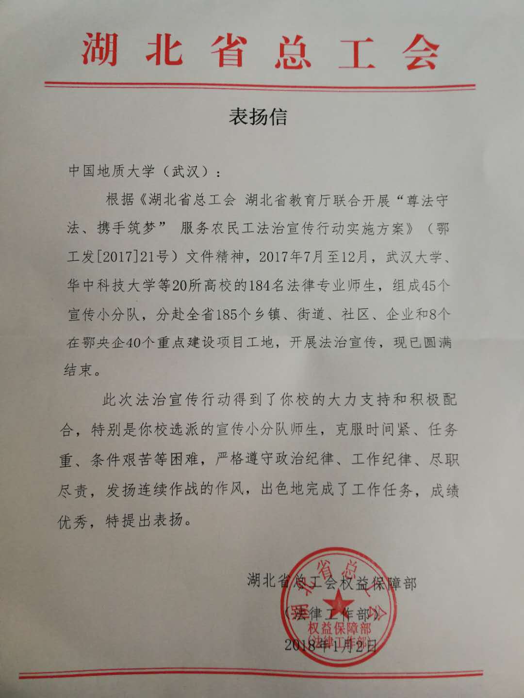 近日,鉴于我校选派的小分队在省总工会和省教育厅联合举办的“尊法守法•携手筑梦”服务农民工法治宣传活动中,克服时间紧、任务重、条件艰苦等困难,严格遵守政治纪律、工作纪律、尽职尽责,作风优良,出色的完成了工作任务,成绩优秀,湖北省总工会特来信予以表扬。